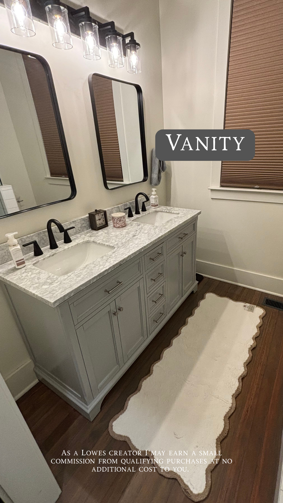 We found the 60β vanity at Lowe's, and it has so much storage space. We paired it with matte black faucets from Delta. I love how it all came together.