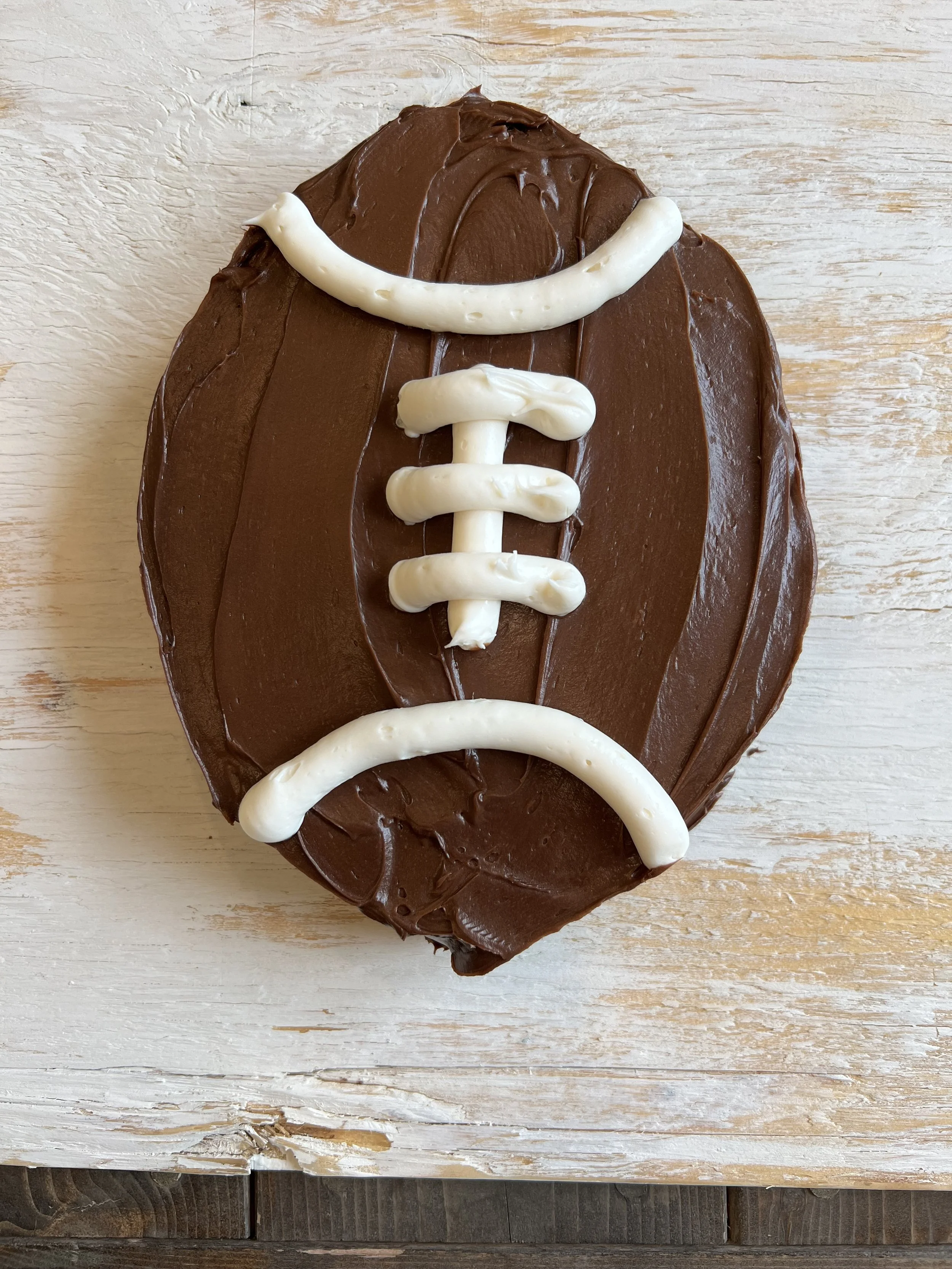 This easy cake is perfect for game day! Start with a simple round cake, cut it into a football shape, and decorate with chocolate and vanilla frosting to make the laces.