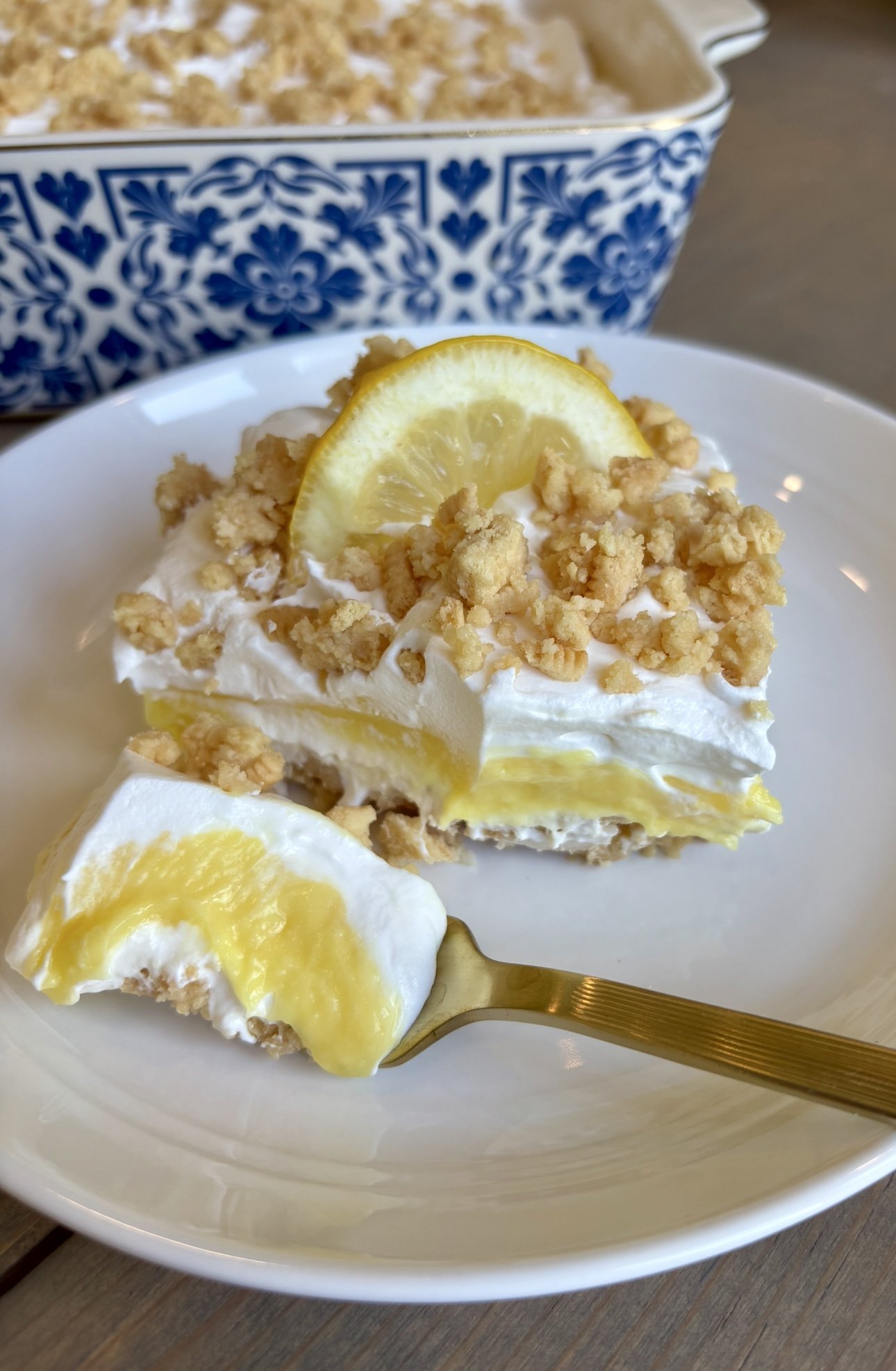 This no-bake Lemon Lasagna has layers of cookie crust, creamy cheesecake, tangy lemon pudding, and fluffy whipped topping — a light and refreshing dessert perfect for summer!