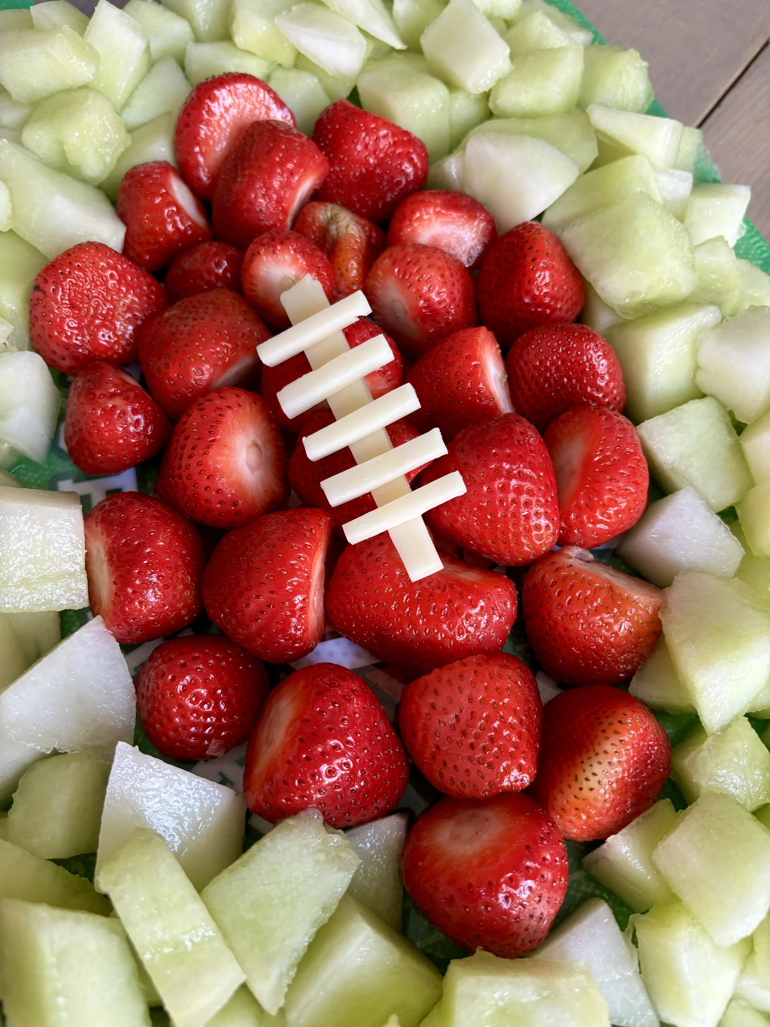 - Place the honeydew pieces around the strawberries to frame the "football".