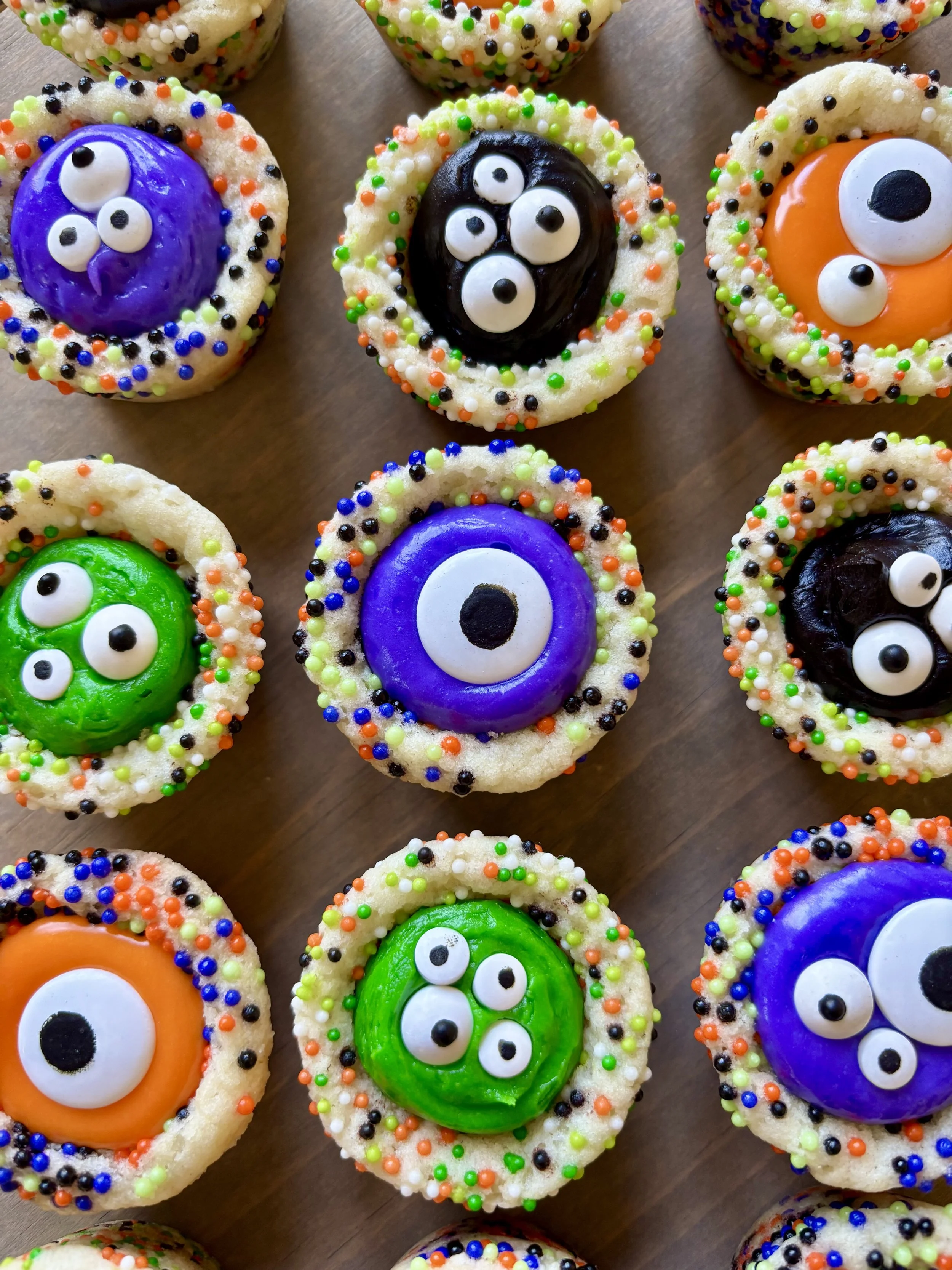 - Fill the well with frosting, or gel icing color for fun details, and top with candy eyeballs.