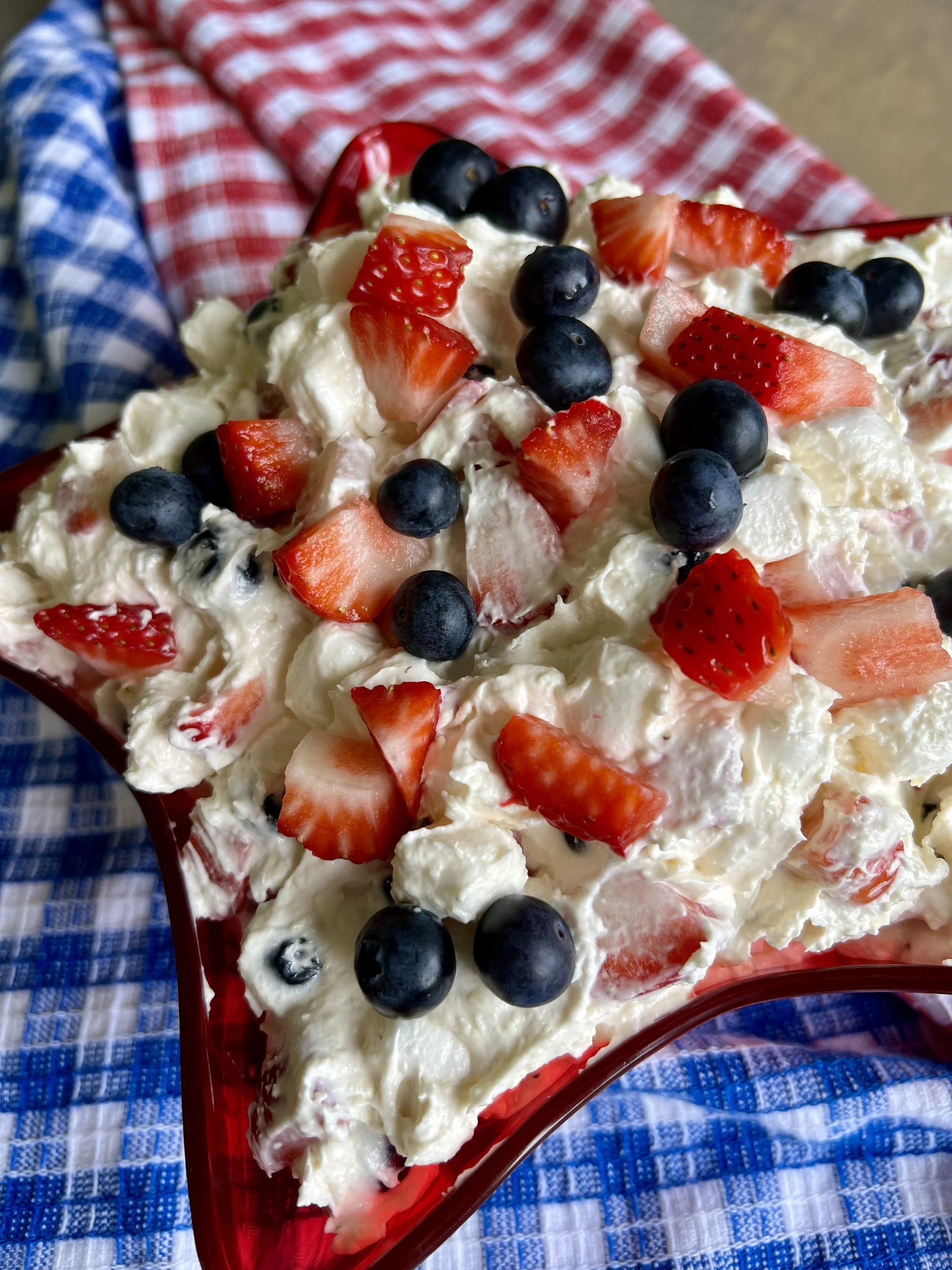 A creamy, fruity dessert salad bursting with strawberries, blueberries, and marshmallows- perfect for patriotic celebrations.