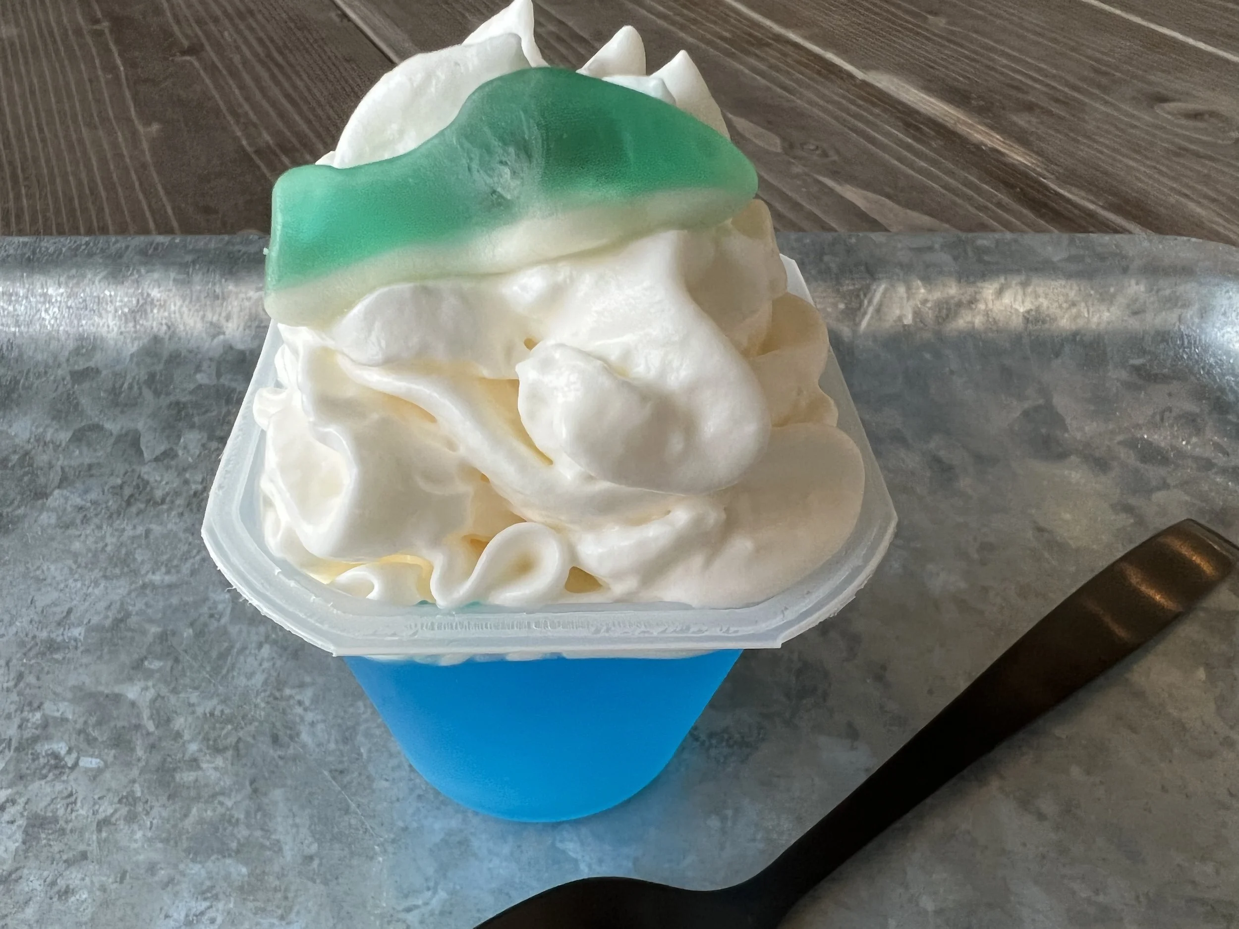 - Add whipped topping to blue jello cups and place Gummi Shark on the top.
