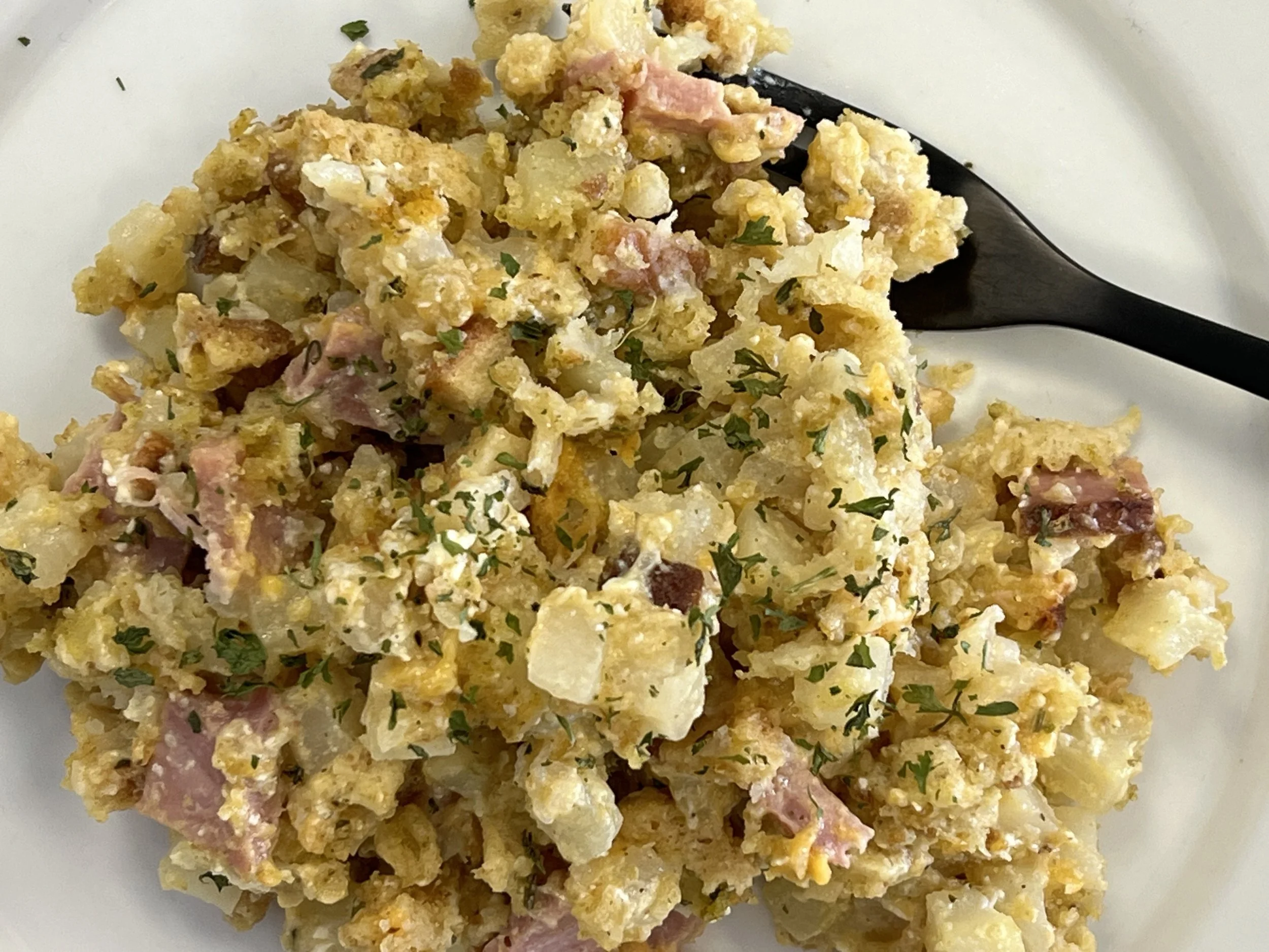 - Combine hash browns, dried onion, salt, sour cream, cream of chicken soup, cheese, and ham and place in slow cooker.